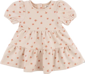 Sweatshirt dress with all-over small daisies print. Featuring puff sleeves and a tiered skirt. Designed in Minnesota. Available in infant, toddler and girls sizes.