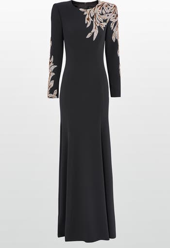 Featuring intricate embellishment across the shoulder and sleeves, this dress offers a refined take on eveningwear. The clean, tailored silhouette is designed to flatter while maintaining a sense of ease and confidence. Full-length sleeves and a floor-skimming hemline add a touch of formality. Well suited for gala dinners, award ceremonies, or elegant receptions.