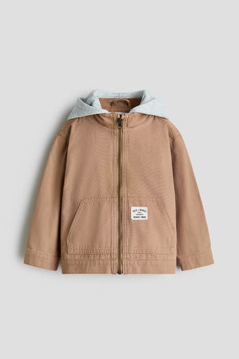 Jacket in cotton canvas with a detachable, jersey-lined hood in sweatshirt fabric. Stand collar, zip down the front and a yoke at the back. Front pockets, gently dropped shoulders and a button at the cuffs. Unlined.