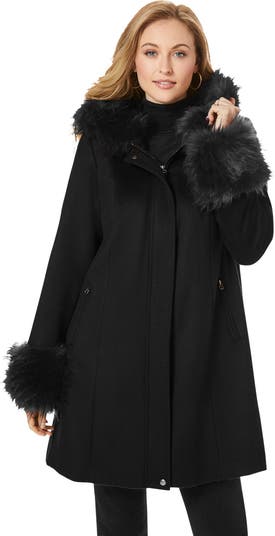 Jessica London Hooded Faux Fur Trim Coat, Alternate, color, Black