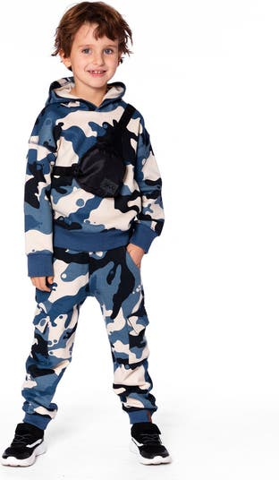Deux par Deux Hooded Fleece Sweatshirt with Crossbody Bag, Main, color, Blue Camouflage