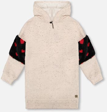 Playful and full of flair, the Hooded French Terry Dress Beige With Heart Bag is a standout piece for stylish young girls. This sweater dress features a roomy hood, a lurex french terry beige body, and long sleeves with a bold faux fur sleeve section with a pink and black heart pattern for a fun contrast. Designed with a sewn-on black heart-shaped bag, it’s made for twirling through fall adventures in total comfort.
