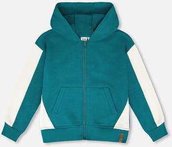 Cool and practical, this hooded French terry cardigan in dark turquoise is perfect for layering on breezy days. Designed with a comfy hood, front pouch pockets, a full-length zipper, long sleeves, and ribbed cuffs and hem, this hoodie combines comfort with a trendy streetwear vibe. The soft cotton-blend fabric makes it easy to wear with any outfit from the “B.O.Y.S.” collection.