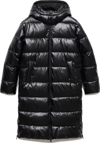 A light sheen lusters a longer-length puffer coat topped with a cozy hood.