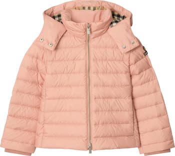 A hooded puffer jacket filled with duck down and feathers, lined in the Burberry Check. The design features B-cut zip pulls and an embroidered Thomas Bear appliqué inspired by our archive, underlined with Burberry lettering.||Two-way zip closure|Side press-stud slip pockets|Storm cuffs|Burberry Check lining|Appliquéd Thomas Bear at sleeve