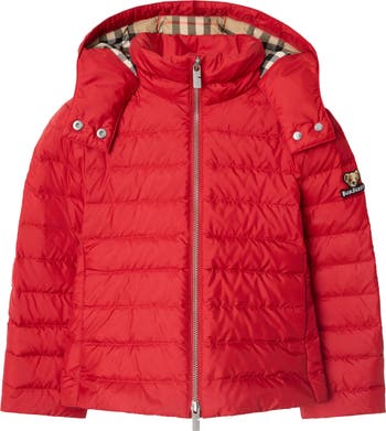 A hooded puffer jacket filled with duck down and feathers, lined in the Burberry Check. The design features B-cut zip pulls and an embroidered Thomas Bear appliqué inspired by our archive, underlined with Burberry lettering.||Two-way zip closure|Side press-stud slip pockets|Storm cuffs|Burberry Check lining|Appliquéd Thomas Bear at sleeve