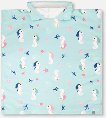 Wrap up the fun after a swim with this hooded beach towel in blue with seahorse print, designed to keep kids cozy and dry. This beach accessory is covered in an allover seahorse, coral, and seashell motif, which brings a playful ocean vibe, while the attached hood adds extra warmth and coverage. Made from soft polyester, it’s lightweight, absorbent, and easy to pack for every seaside adventure.