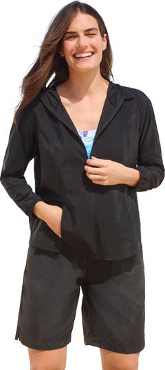 Protect yourself from all the elements—a beating sun, gust of wind or sudden rainshower—with this hooded cover up. Woven from quick-drying and water-repellant nylon Taslon, this hoodie features a chin guard and elasticized long sleeves for maximum coverage. Princess seams on its zip front create a tailored, flattering silhouette, perfect for going out after a dip. Side pockets. Back ventilation panel.