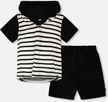 The hooded terry t-shirt with shorts set is perfect for seaside style and comfort. This two-piece set includes a short-sleeve hooded t-shirt in black and white stripes and matching solid black shorts, crafted in soft terry cotton blend for breathable wear. Easy to pull on with an elastic waist, adjustable drawstring, and casual fit, it’s a versatile summer outfit for boys.