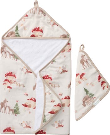 Cut from cotton-enriched muslin that feels soft against baby's skin, this set includes a hooded towel with an absorbent terry backing and a matching washcloth.
