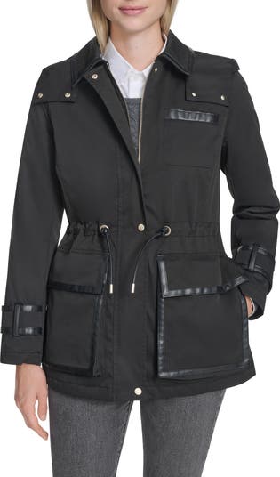 Be ever all-weather ready with this raincoat featuring a removable hood, an adjustable fit, a soft quilted lining and multifunction pockets—all done in a water-resistant fabrication and trimmed in faux leather.