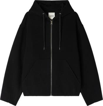 Hoodie-style jacket in double-faced wool, with a drawstring hood and a zip fastening on the front.