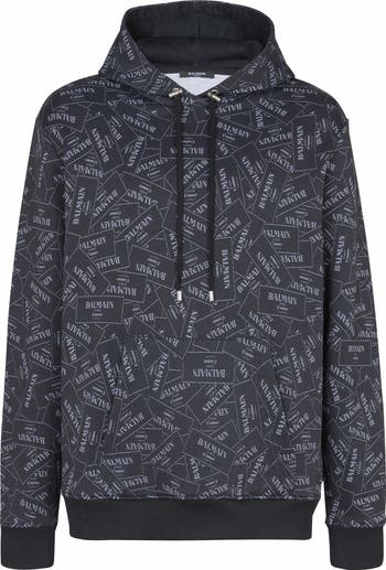 Hoodie with all-over Balmain label print Round neckline Adjustable hood with drawstring Engraved silver aglets, eyelets and stoppers Long sleeves Kangaroo pocket Ribbed trim Regular fit Model measures 190cm and wears a size M Main material: 59% polyamide 41% cotton Made in Bulgaria Item: EH1JT047GE38