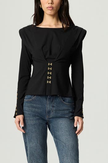 Add a refined edge to your knitwear lineup with this slim-fit blouse, designed for a structured yet comfortable look. Featuring padded shoulders and soft knit construction, the silhouette is elevated with front and back pleating and adjustable hook fastenings along the sleeves. The crew neckline and long sleeves lend a clean, contemporary finish, making it a versatile piece for both office styling and modern layering.