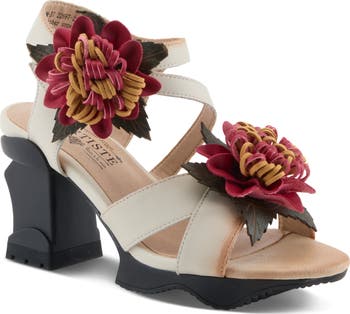 Chrysanthemum-inspired flower appliqués adorn the straps on this summery sandal rendered in rich leather and set on an artistic heel.