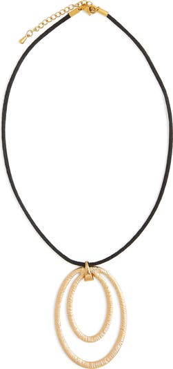 A textured, double-hoop pendant in goldtone plate brings luminous shine to this modern necklace styled with a silk cord and lobster clasp closure.