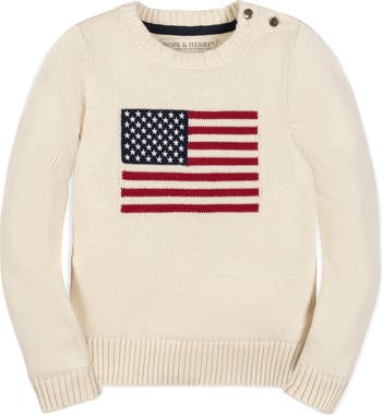 Our cozy and cool crew neck sweater is crafted in soft organic cotton and features a heritage American flag intarsia with embroidered stars. A timeless pullover silhouette that they will love for years to come.