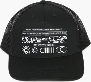 Hope Over Fear Hat features bold typography collage design printed on the front.