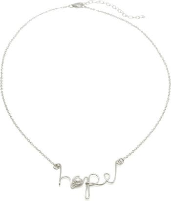 A 15 1/4" sterling silver cable chain suspend a sterling silver wire fashioned to say Hope with a freshwater pearl as the ‘o’. A 3 inch extender and lobster clasp create a 17 to 20 inch total length necklace.