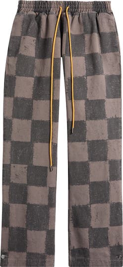 A bold check patterns sturdy cotton pants closed with a comfy drawstring.