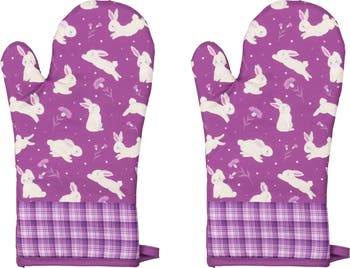 Add a touch of Easter charm to your kitchen with this delightful set of oven mitts. These oven mitts are adorned with adorable white Easter bunnies and delicate lavender-colored flowers. The plaid border edge adds a festive touch, while the matching loop for hanging makes storage a breeze. Keep your hands safe and your kitchen stylish this Easter season with these charming and functional oven mitts. Product Features: Set of 2 floral Easter bunny oven mitts Hoppping bunnies and lavender-colored floral design Plaid bottom border edges One-sided design with solid purple reverse sides Anti-scald interior Each comes with a matching purple loop for hanging Care Instructions: spot clean with mild detergent and air dry Dimensions: 13” high x 7“ wide Material(s): polyester Note:Set includes 2 of the design shown