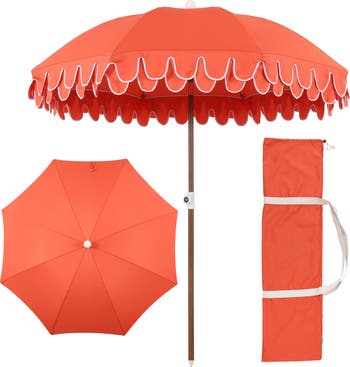 Stir up some midcentury glamor with this classic scalloped umbrella. It features a sturdy iron frame covered in durable outdoor canvas, and a tilt feature via push button. The double-scalloped edge makes this umbrella chic enough for relaxing at the beach in style.