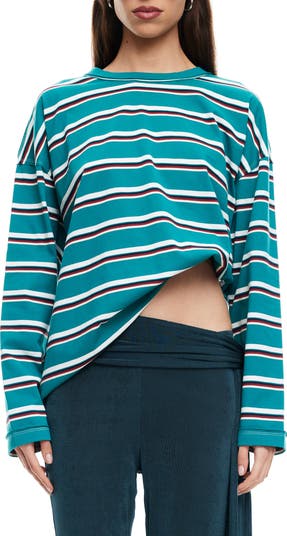 Dropped shoulders enhance the relaxed fit of this soft cotton-blend top covered in lively stripes.
