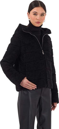 Rich in texture and warmth, this hooded zip jacket features horizontal curly shearling lamb—delivering a cozy yet contemporary silhouette with casual refinement.