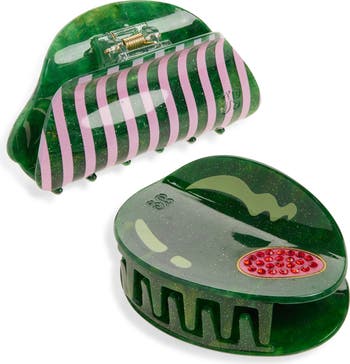 Serve whimsical looks with this duo of glossy jaw clips garnished with crystals and glitter.
