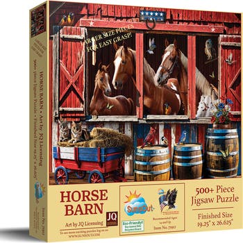 Horse Barn 500 Piece Jigsaw Puzzle - 500 pc Jigsaw Puzzle - Completed Size: 19.25" x 26.625" - Puzzle Artist: JQ Licensing - Interlocking Pieces and Durable Construction: SunsOut jigsaw puzzles feature interlocking pieces that fit securely, making assembly easier and reducing frustration. Made with high-quality recycled cardboard, they are durable and to easy to work with - Warranty: SunsOut puzzles being made in the USA ensures high manufacturing standards include a worry-free guarantee ensuring any issues with missing or damaged pieces are resolved, reflecting SunsOut's commitment to quality and customer service. - Eco-Friendly Materials: SunsOut puzzles are crafted with eco-friendly materials