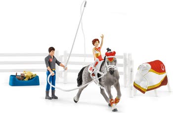HORSE CLUB: MIA'S VAULTING - The little girl, Mia, can perfectly prepare for her first competition with the help of the vaulting set by schleich HORSE CLUB. The male riding instructor, Tom, steadies the show horse using the vaulting harness and gently flicks the whip in his gripping hand so that the horse runs evenly in a circle within the fence parts, which can be plugged in as desired. Hannah's sister, Mia, has moving arms to hold on to and accept the big golden trophy. Saddle, bridle and blanket are removable and stored on the overhead storage shelf after training. The brown kitten watches the events with interest, as she snuggles into her cozy little basket. Explore the lively world of Lakeside with Mia's Vaulting Set, a fun, educational toy playset from Schleich! This playset is authentically detailed and is ideal for hours of imaginative play. 18 pieces. SCHLEICH: As an 85-year-old German toy company, we are committed to manufacturing realistic toys with the highest standard of quality and safety for years of durable play and collectability. All products and the materials used meet or exceed the strictest applicable toy safety requirements.