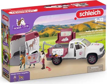 HORSE CLUB: MOBILE VET W/ TRAILER - 90 piece set - Mrs. Kramer has a new pick-up truck for her mobile veterinary practice! She has a horse trailer with her so that she can transport her patients safely. The Tennessee Walker foal is not doing well at all. The mobile vet has to come by with a trailer. Mrs. Kramer has lots of medical instruments and even an X-ray machine on the trailer of her pick-up. That means she can look after the animals wherever she is. The little foal is sure to be back on its feet soon. Oh dear, the Tennessee Walker foal has been injured. It’s limping and needs to be examined urgently. It’s so lucky that the mobile vet with her trailer is not far away. Mrs. Kramer arrives soon in her pick-up truck. The first thing she does is to take an X-ray. Luckily, nothing is broken. She puts some ointment on the leg and then carefully applies an adhesive bandage. As a reward, she holds out a carrot to the foal. There you go, at least it’s eating! The little one will soon be completely healthy again. Discover the world through play with the authentic and detailed figures from schleich. They look so real, they may just start to run! This schleich product is part of the HORSE CLUB theme world and is suitable for children. Large pick-up and detachable horse trailer! X-ray machine with three X-ray images! The X-ray machine comes with three X-ray images. Extensive range of accessories! Mrs. Kramer is fully mobile. The horse trailer is detachable. Dimensions: 18.90 x 4.33 x 12.60 inch.