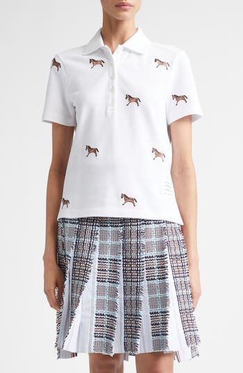 Rendered in breathable cotton with an allover cavalcade of embroidered horses, this polo turns a staple into a conversation piece with texture and motion. Signature tricolor grosgrain trims the drop-tail hem, while buttoned side vents open or narrow the profile as the day shifts.