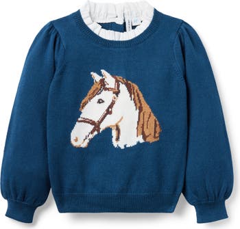 Take the reins in our intarsia-knit horse sweater. A contrast ruffle trimmed collar and puff sleeves make it even better.