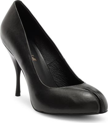 A cloven toe brings unconventional flair to an otherwise classic pump made from soft leather and lifted by a tapered stiletto heel.