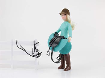 - Includes: 6" articulated doll, English saddle and bridle, and saddle pad.This 6” articulated English rider is looking stylish in her plaid breeches, and has a coordinating saddle pad for her horse!