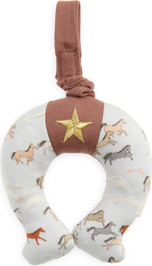 Your child with delight in the cute look and plush feel of this adorable horseshoe toy featuring a built-in rattle and galloping horse print. This toy is ideal for for strollers, car seats or diaper bags.