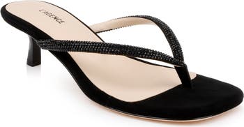 Sparkling crystals accentuate the narrow straps of an effortlessly glamorous sandal lifted by a kitten heel.