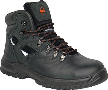 Rugged men's work boot with a full-grain leather upper and ASTM F2413-18 steel safety toe for dependable protection. HyDry waterproof membrane keeps feet dry, while the direct-attach dual-density slip-resistant outsole improves traction on wet and uneven surfaces. Premium PU memory foam insole delivers all-day cushioning, and the boot meets ASTM F2413-18 M/I/C standards with Electrical Hazard (EH) protection, finished in black with orange accents.