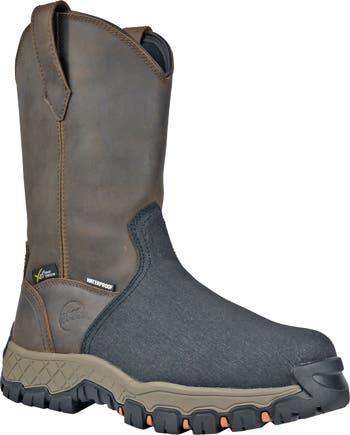 Built for demanding, high-risk job sites, the HOSS Recon 11 Inch Composite Toe Met Guard Work Boot delivers rugged protection, waterproof performance, and dependable comfort in a pull-on Wellington design. This heavy-duty work boot features a composite safety toe certified to ASTM F2413-18 M/I/C EH MT, providing reliable impact, compression, and electrical hazard protection in a lightweight, non-metallic build. The upper combines scratch-resistant leather vamping with full-grain leather for long-lasting durability and a professional appearance. An internal metatarsal guard protects the top of the foot during heavy-duty tasks. A waterproof membrane helps keep feet dry, while an ASTM F3445-21 slip-resistant rubber outsole delivers confident traction on slick and uneven surfaces. Designed for oil, gas, construction, and industrial environments, the Recon Met Wellington is built for long, demanding shifts.