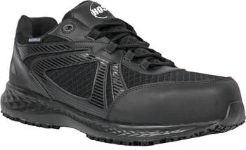 Built for demanding workdays that require mobility protection and all day comfort the HOSS Reno II Composite Toe Lightweight Athletic Work Shoe delivers dependable safety in a sleek athletic design. This women’s work shoe features a 100 percent non-metallic composite safety toe certified to ASTM F2413-18 providing reliable impact and compression protection without the weight of steel. The action leather and nylon mesh upper enhances breathability and durability while a waterproof membrane helps keep feet dry in wet conditions. A fiberglass shank reinforces midfoot stability and support and lightweight cement construction improves flexibility for long term wear. Finished with a highly slip-resistant carbon rubber outsole and ASTM F2413-18 M/I/C Electrical Hazard protection the Reno II is built for fast paced warehouse manufacturing and distribution environments.