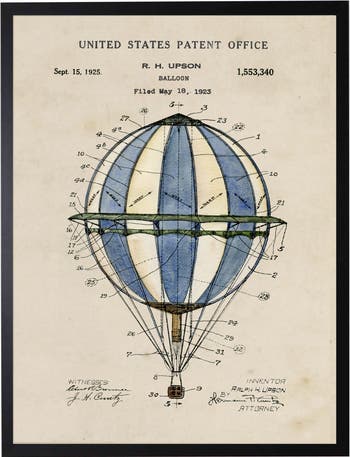 This vintage-inspired print, framed in a black wooden frame, features a hot air balloon patent. Sized at 16 inches by 20 inches, this made in the USA frame makes for a beautiful addition to any wall.