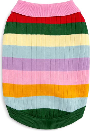 Cozy and critter-approved, this brightly striped pet sweater with a fuzzy hotdog appliqué brings colorful personality to any cold-day outing.