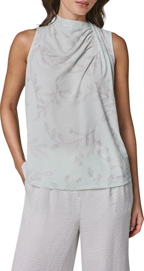 Lustrous embellishments elevate this lightweight sleeveless top textured with a twisted neckline drape.
