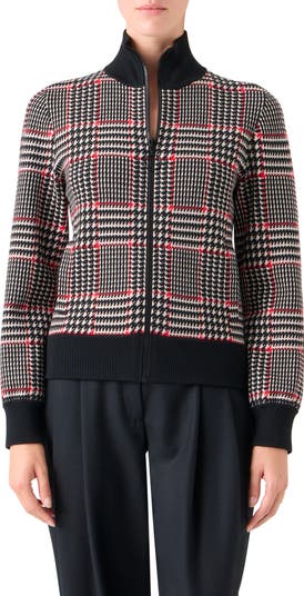 Akris punto Houndstooth Check Virgin Wool & Cashmere Zip Cardigan, Main, color, Black-Vermillion-Cream