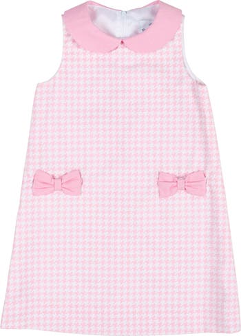 Timeless and sweet, this pink-and-white houndstooth twill dress is highlighted by classic bow pockets, a charming Peter Pan collar, and an easy-to-wear A-line shape, beautifully finished with a practical back zipper.