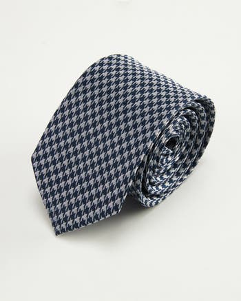Each silk tie is brought to life through 10 exquisite steps of artisan craftsmanship. Woven from pure silk twill, this tie features a classic houndstooth pattern in deep navy and soft ivory tones�an enduring motif rooted in tailoring heritage. The finely balanced weave creates depth and movement, revealing subtle contrast as the light shifts. Polished yet distinctive, it offers a refined expression of tradition with a modern edge