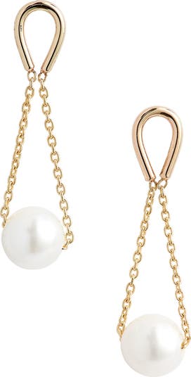 A pinched arch stud and draping pearl-strung chain mimic an hourglass, highlighting the timeless beauty of these swingy earrings handcrafted in 14-karat gold.