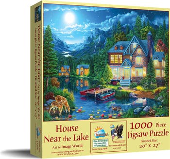 SUNSOUT INC introduces the House Near the Lake 1000 pc Jigsaw Puzzle, an enchanting gateway allowing you to immerse yourself in the serene beauty of a charming house nestled by a tranquil lake under a moonlit sky. Precision crafted, SunsOut Puzzles provide an excellent and satisfying fit made from high-quality recycled cardboard and soy-based inks. The vibrant colors and crisp details in the puzzle promise a rich and immersive experience every time. The 20" x 27" puzzle features licensed artwork from Image World, making it a collector's delight. Each piece unfolds a world where nature and architecture harmoniously coexist. Made in the USA by a woman-owned small business, SunsOut Puzzles ensure excellent quality and support, committed to swiftly resolve any issues that arise, reflecting a dedication to customer satisfaction. The production of the puzzle aligns with eco-friendly efforts, as it's made from the highest quality recycled-board, reducing waste, and delivering an exceptional product. Unravel the visual stories in this 1000-piece puzzle either as a delightful and relaxing gift to yourself or a loved one—it's not just an activity, but a relaxing retreat, and a perfect way for adults to relieve stress and stimulate their minds. Immerse yourself in this mesmerizing puzzle today and experience artistic fulfillment coupled with relaxation.
