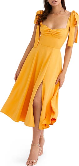 Channel sunny-day vibes in this bold midi sundress topped by flirty shoulder ties and styled with a sultry side slit.